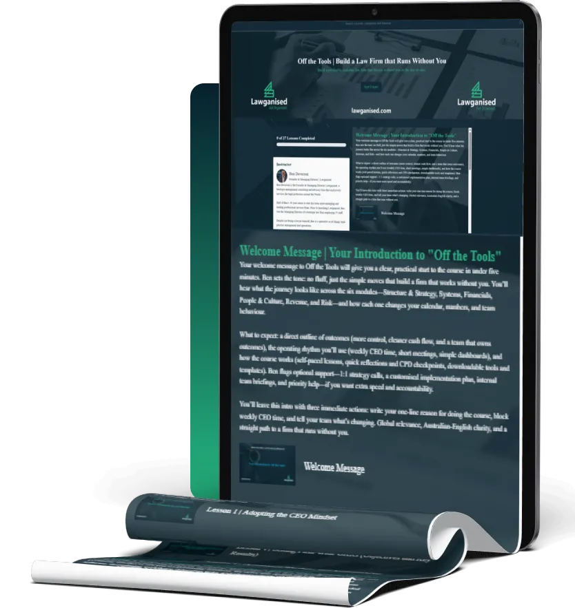 Direct access weekly to Ben Deverson, or a member of the experienced Lawganised team, for 3 months (12 sessions) to support real-time implementation, problem-solving, and coaching.